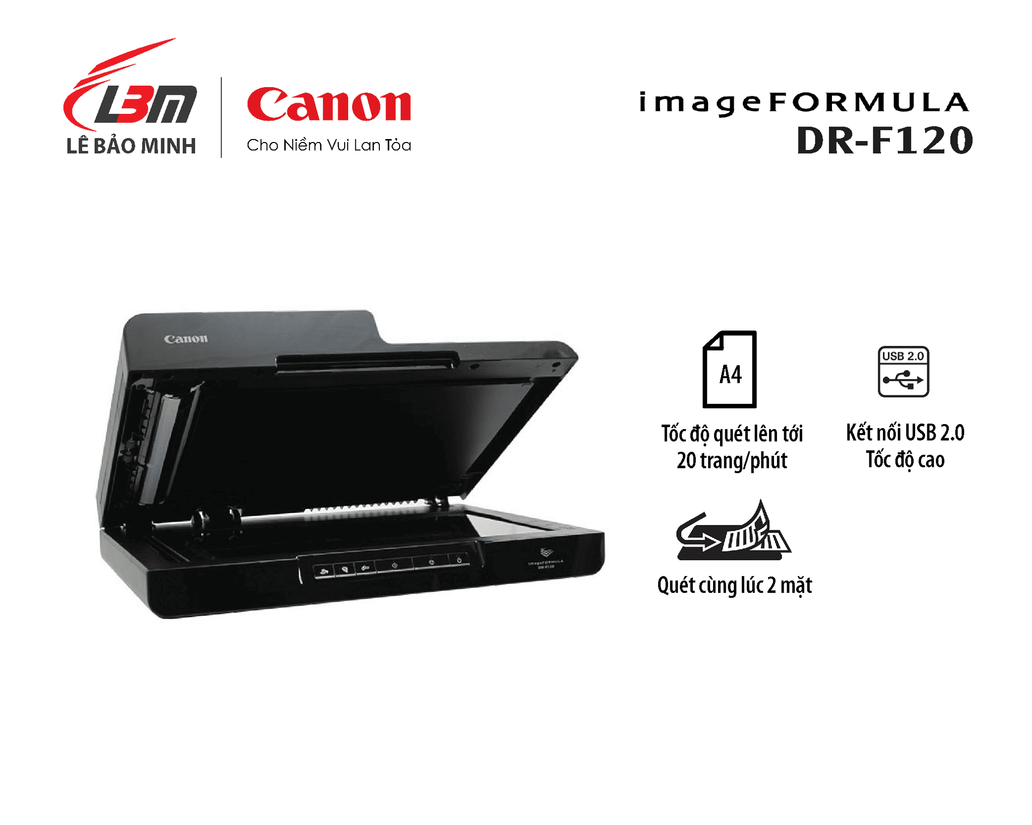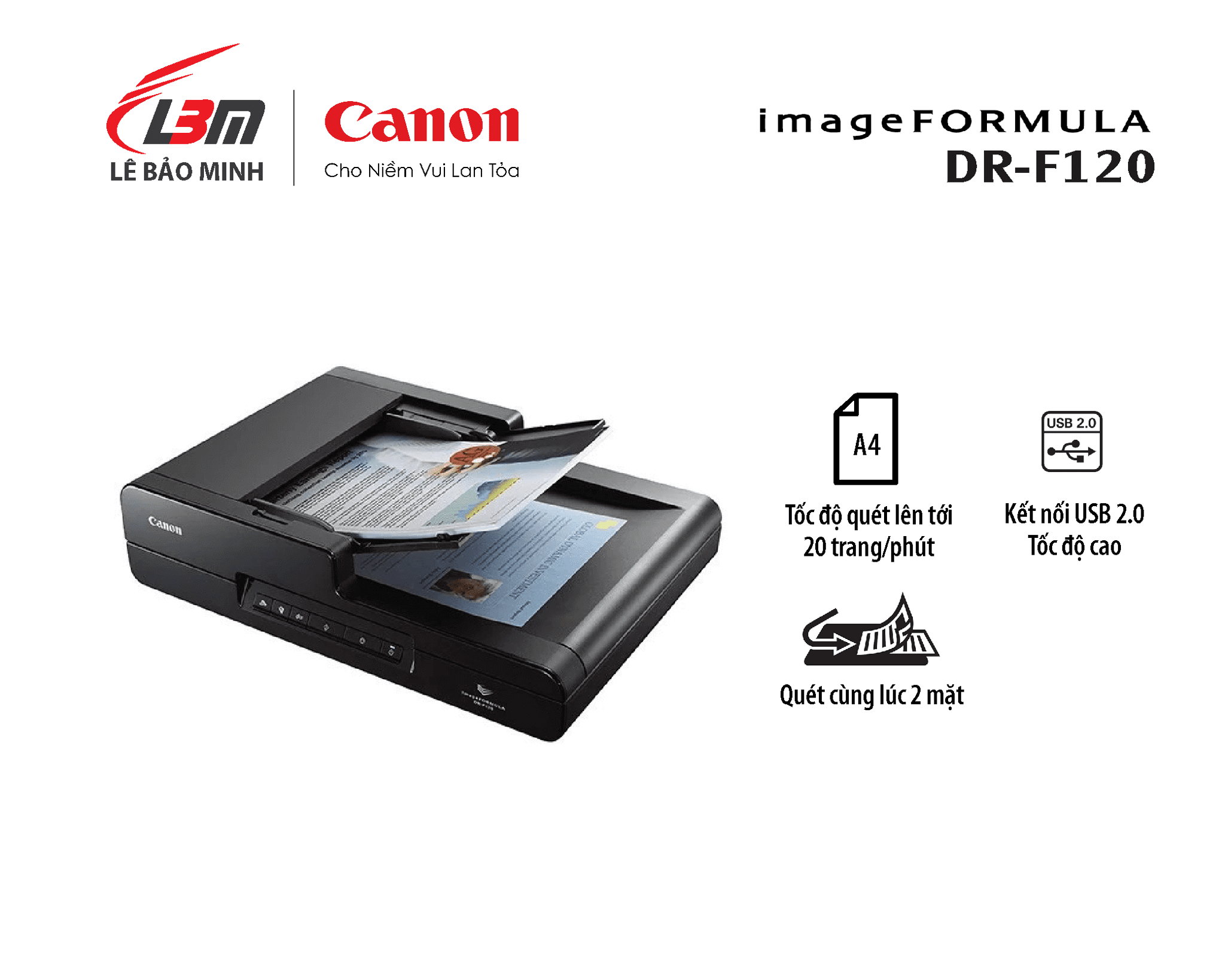 Kết nối USB 2.0Kích thước quét: lên tới A4(ADF), khổ Legal (Flatbed)Tốc độ: lên tới 20 trang/phút (một mặt) / 36 trang/phút (2 mặt cùng lúc)